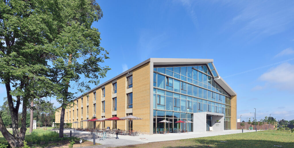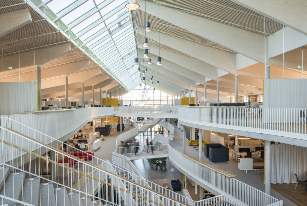 Dachelemente ca. 12 x 2,50 m, ~ 3300 m² aus KVH/BSH Rippe, Dämmung Mineralwolle d = 28 cm, unterseitig mit Promatbeplankung einschließlich Untersicht aus Weißtanne Leisten + Akustikdämmung, integrierte Anschlusselemente für Sprinklerleitungen und Leerrohre für Elektroinstallation, Dachaussteifung über Scheibenausbildung der oberseitigen OSB-Platte, Einleitung der Aussteifungslasten in 4 Treppenhauskerne aus Stahlbeton.