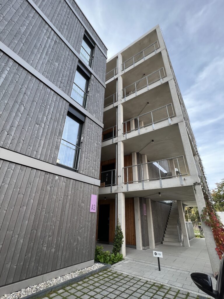 Angefangen bei der Spezial-Gründung durch CSV-Säulen, über die Ausbildung von Kriechgängen und erdgeschossigen Stahlbetonbauteilen, die das gesamte Bauvorhaben verbinden, zeichnet sich das Projekt durch die Holz-Hybrid Bauweise der obergeschossigen Apartments aus.