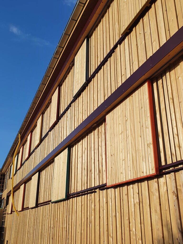 Die Fassade aus Tannenbrettern unterschiedlichen Querschnitts strahlt nun im Sonnenlicht. Der Schattenwurf vorstehender Bretter gibt dem Gebäude einen ganz eigenen Charakter.