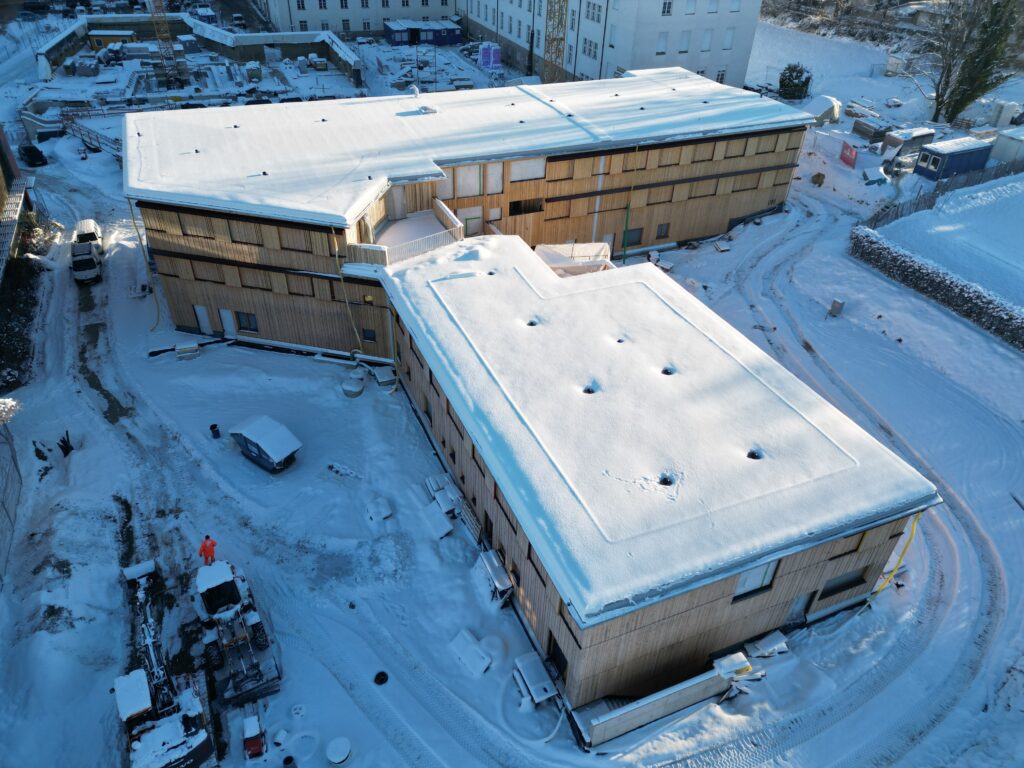 kompletter Holzbau wurde in der GROSSMANN Werkstätte in Rosenheim vorgefertigt und die Elemente in Traunstein montiert.