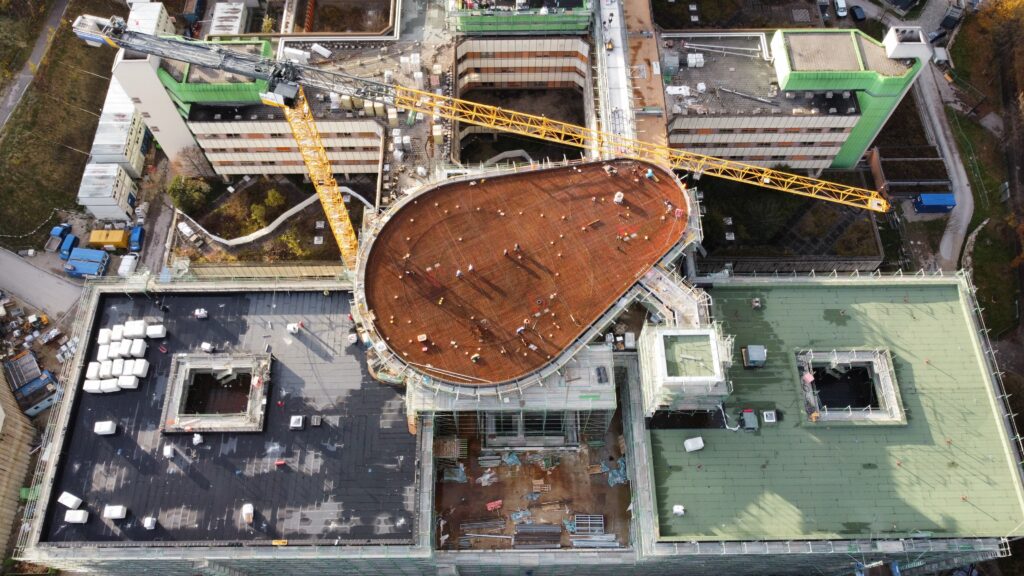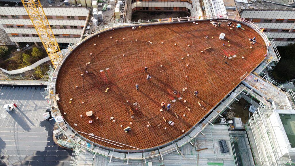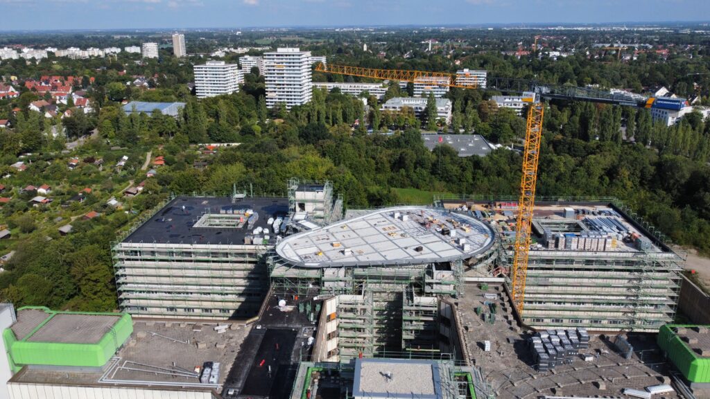 Auf dem Gebäude aufgesetzt kommt ein Hubschrauberlandeplatz mit einer Tragkonstruktion aus Stahl (Ca. 250t) mit einer Landplattform aus Beton