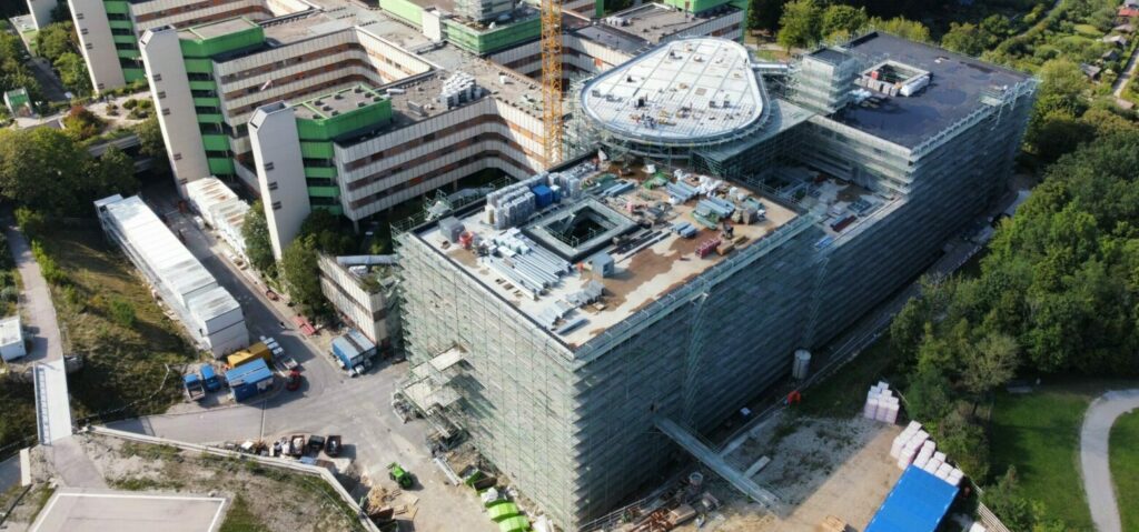 Eines der größten Krankenhäuser Münchens baut aus: mit über 1.200 Betten ist Klinik Bogenhausen auch künftig ein Maximalversorger. Der Erweiterungsbau wird das Krankenhaus zu einer Hochleistungsklinik mit moderner OP-Architektur hochheben. Er schließt an der Ostseite an das bestehende Gebäude ebenen gleich an. Ein wichtiger Aspekt: während der gesamten Bauphase bleibt die Patientenversorgung vollumfänglich erhalten.