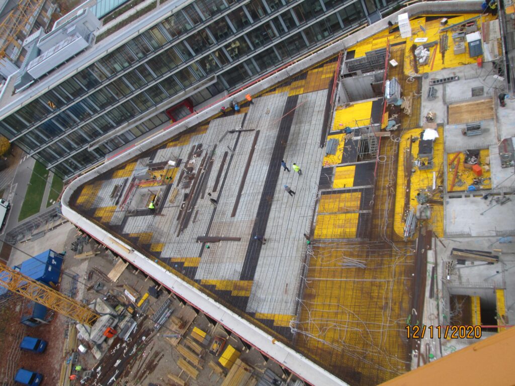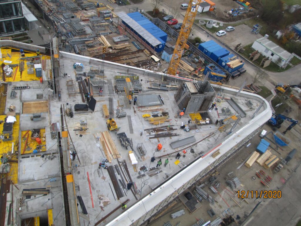 In allen Stockwerken werden an den Deckenrändern Fertigteil L-Winkel mit einer Höhe von 1,20m und einer Ausladung von 1,00m montiert. Die Fertigteile sind bis zu 7m lang und 11 t schwer.