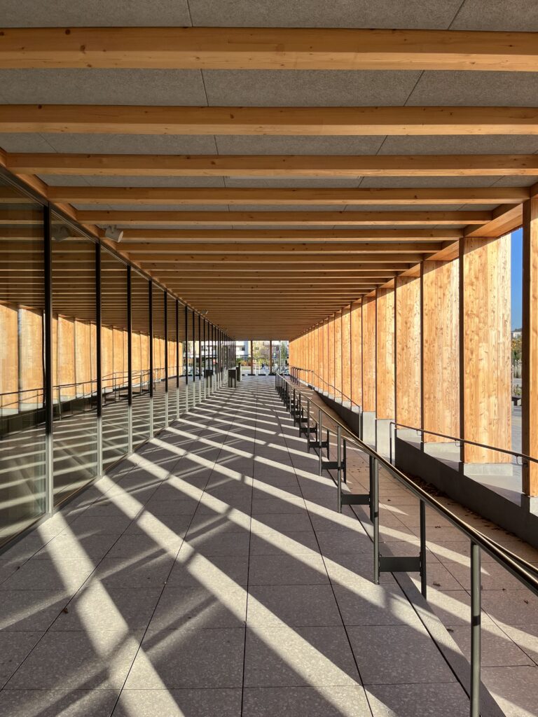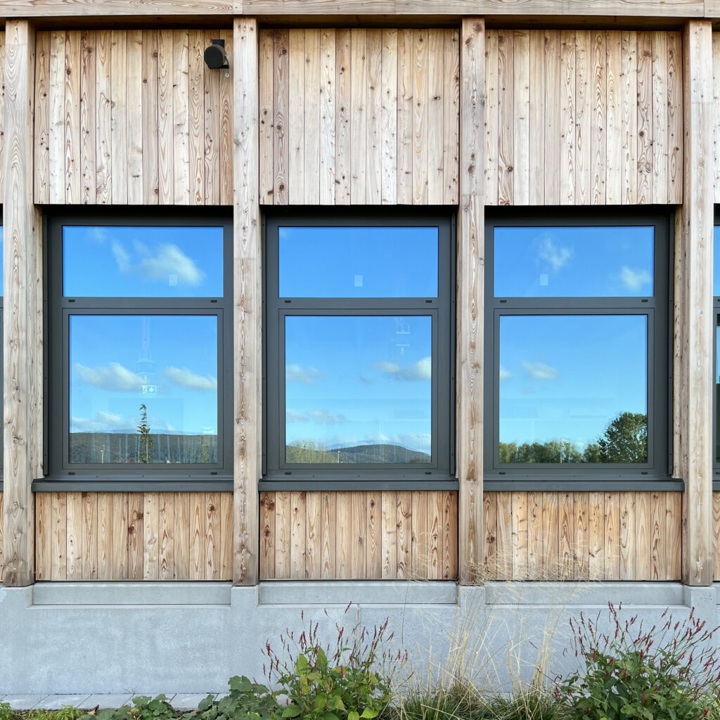 Eine Lärchenschalung mit vorspringenden Lisenen formt die attraktive Fassade in einem regelmäßigen Raster von 1,65m, welche auch vier Innenhöfe umrahmt. Auch die Brandschutzanforderungen sind mit sichtbarem Holz gelöst. Das verbaute Holz ist heimische Fichte bzw. Lärche, 100% PEFC-zertifiziert.