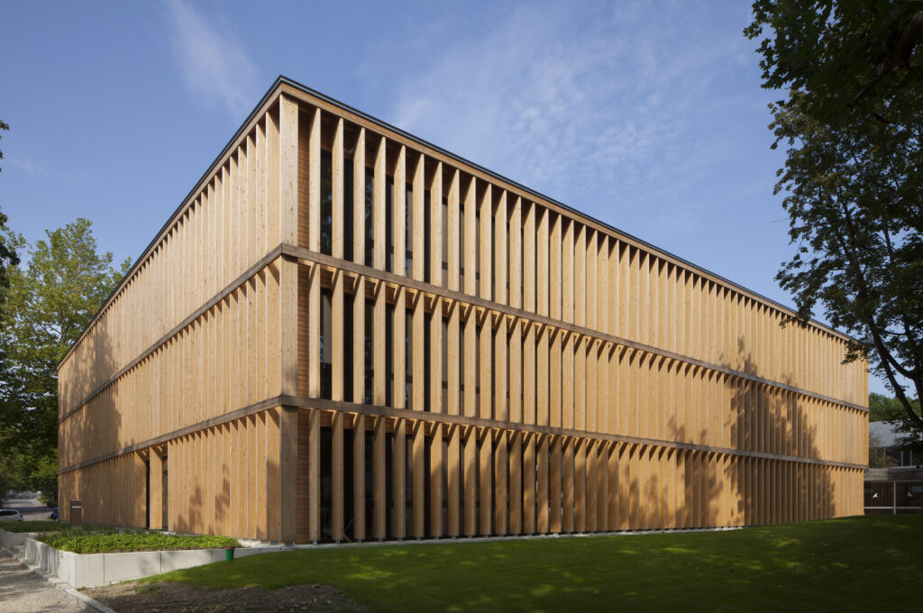 - Holz-Skelettbau mit aussteifendem Hartbetonkern